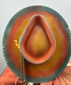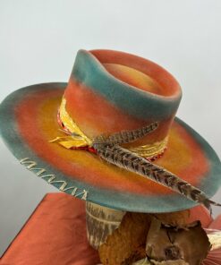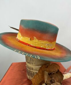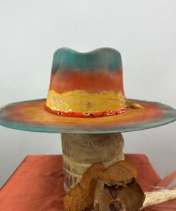 “Fedora The Painted Desert ” is hand-distressed, hand-dyed, and hand-torched, ensuring no two share the same color or design. Each piece is uniquely imperfect, with subtle variations from product images.
