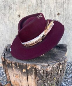 “Mulled Wine Vintage Felt Wide Brim Hat” is hand-distressed, hand-dyed, and hand-torched, ensuring no two share the same color or design. Each piece is uniquely imperfect, with subtle variations from product images.