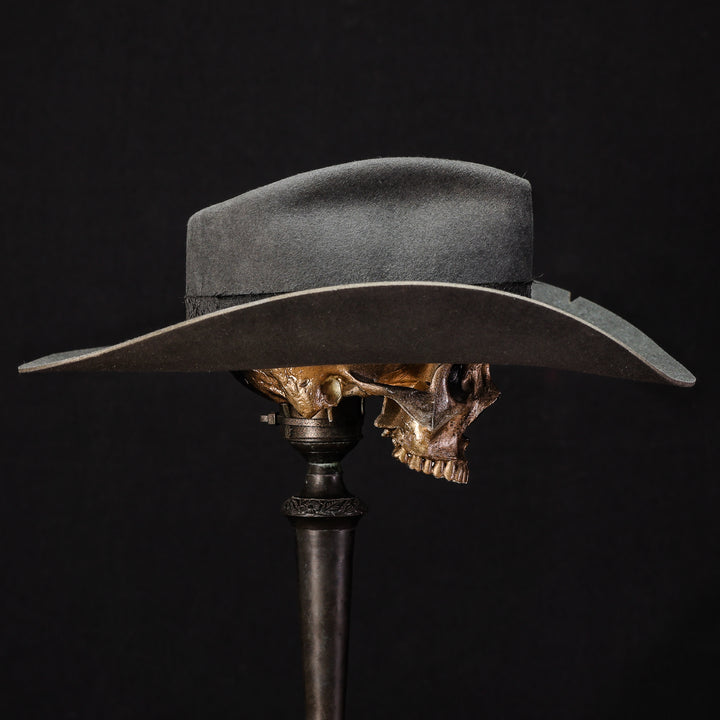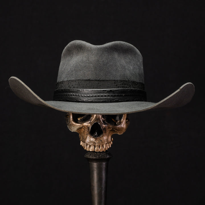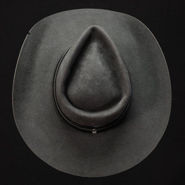 This clean 100X Beaver Teardrop with a heavy western brim is simple and severe. Wrapped in custom embossed black leather and a heavily textured black fabric. This badass cowboy kicker is ready to hit the trail or the town.