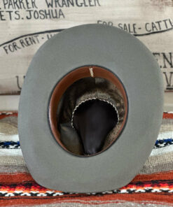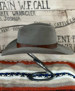 It has a low profile Gus creased crown that is 4.75″ in the back and slopes to 4.25″ in the front. The 3.75″ brim has a small pencil curl on the sides and a nice slope in the front and back. It is topped off with an antique looking leather hat band. We really like this one with its unique look and versatility.